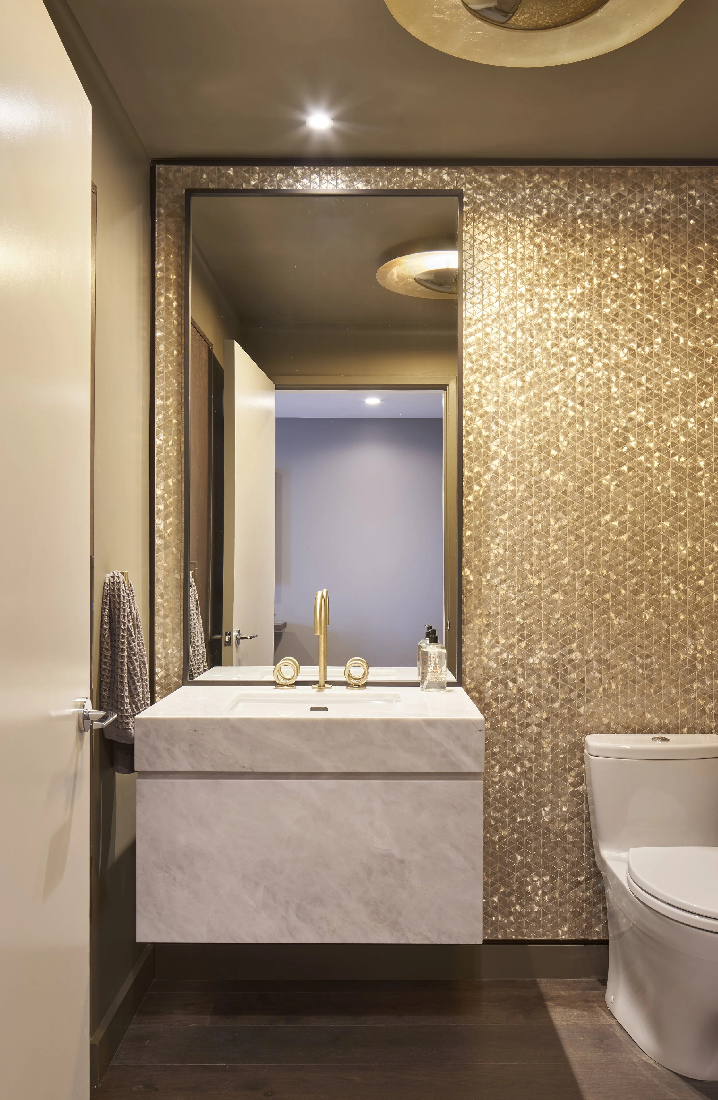 Jewel Box powder room with mosaic tile feature and floating marble vanity with stunning bronze fixtures by THG